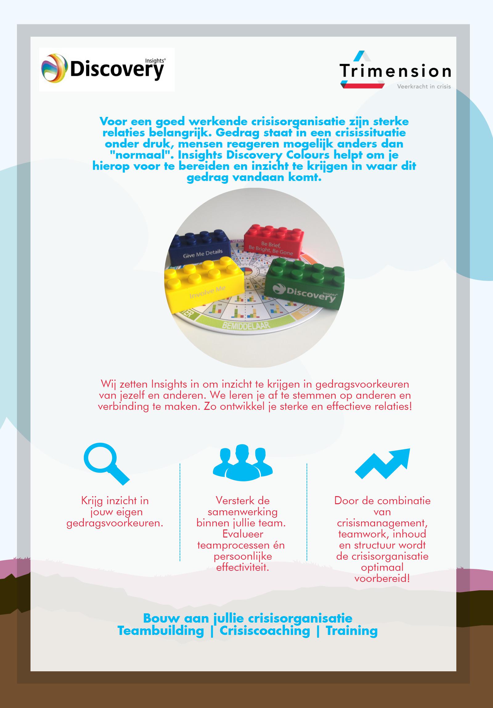 Met Insights ontdek je de betekenis van voorkeuren in gedrag en leer je af te stemmen op en verbinding te maken met anderen om zo sterke en effectieve relaties te ontwikkelen. Insights biedt hierdoor de gelegenheid om teams, vanuit de focus van gedrag, beter te prepareren op crisissituaties. De combinatie van crisistraining en Insights levert mogelijkheden op om de human factor op gestructureerde wijze aandacht te geven binnen het geheel van een OTO crisistrainingsprogramma. Zowel in de voorbereiding (bijvoorbeeld op het vormen van teams), tijdens de crisistraining als in de evaluatie van de training.