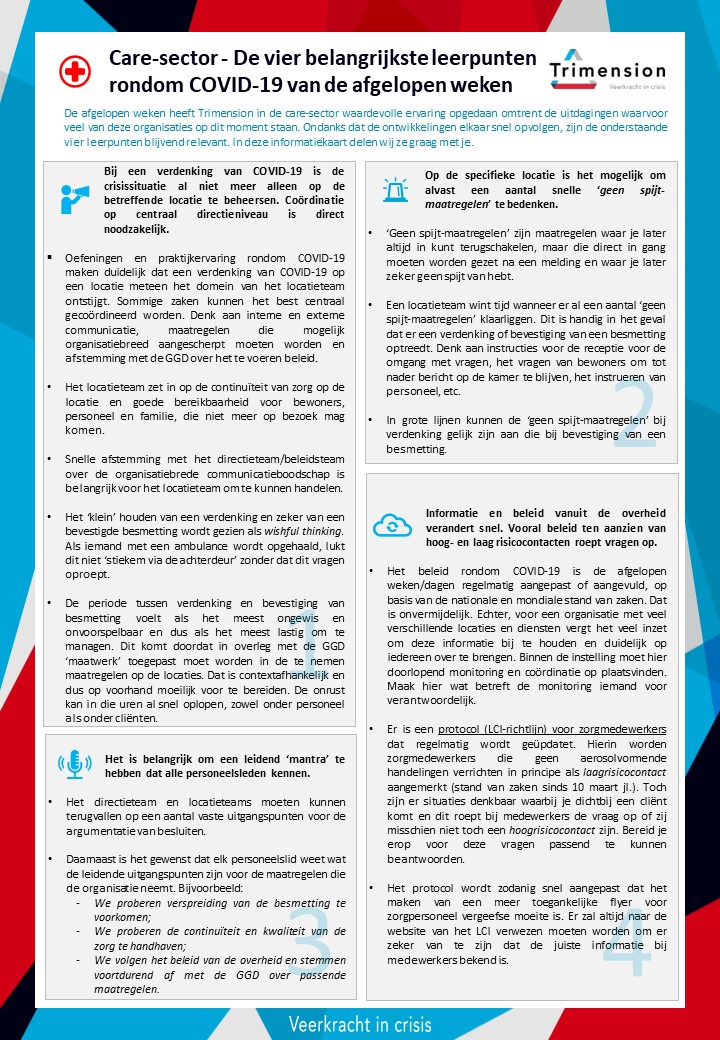20 March 2020De afgelopen weken heeft Trimension in de care-sector de uitdagingen onderzocht die de huidige situatie rondom COVID-19 voor care-instellingen met zich meebrengt. Ondanks dat de ontwikkelingen elkaar snel opvolgen, ziet Trimension vier leerpunten die voor onze relaties in de care-sector blijvend relevant zijn. In onderstaande infographic zetten we ze op een rij.