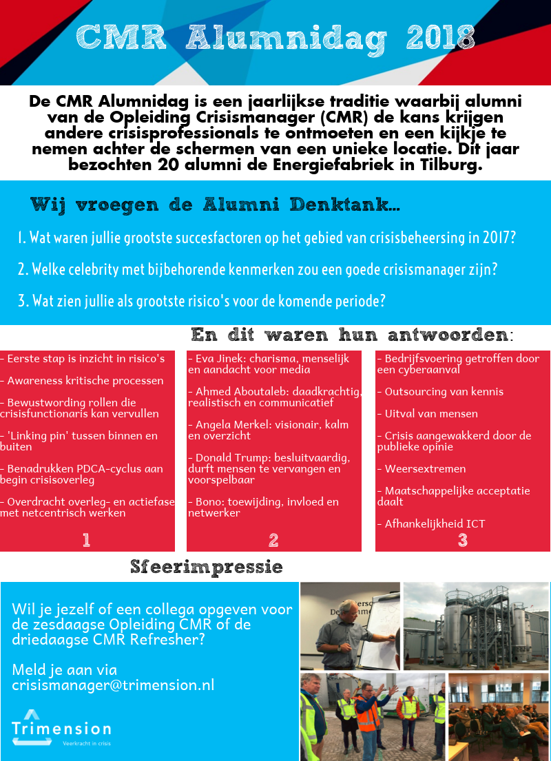 14 February 2018Op 25 januari 2018 vond de jaarlijkse CMR-alumnidag van Trimension weer plaats. 18 alumni van 13 verschillende organisaties waren op bezoek bij Waterschap de Dommel, waarna na een inhoudelijk onderdeel (crisismanagers als denktank) per touringcar de Energiefabriek in Tilburg werd bezocht. De samenvatting van de succesvolle dag vind je hieronder.