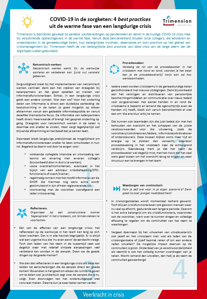 24 April 2020Begin maart deelden we, op basis van ervaringen uit pandemieoefeningen, zeven succesfactoren voor samenwerking in de zorgketen. Inmiddels doet Trimension, samen met zijn opdrachtgevers, veel waardevolle praktijkervaring op. We delen graag onze vier best practices uit de warme fase in de zorgketen van de afgelopen weken.