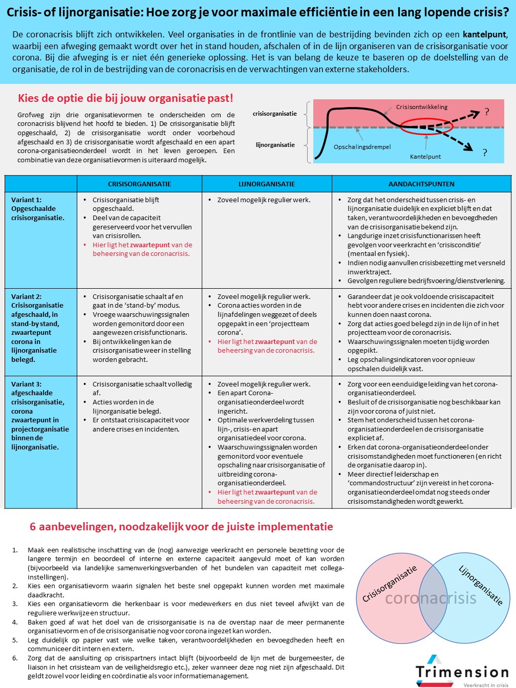 18 June 2020De coronacrisis blijft zich ontwikkelen. Veel organisaties in de frontlinie van de bestrijding bevinden zich op een kantelpunt, waarbij een afweging gemaakt wordt over het in stand houden, afschalen of in de lijn organiseren van de crisisorganisatie voor corona. In deze blog zetten we de verschillende organisatiestructuren op een rijtje en geven we zes aanbevelingen voor de juiste implementatie.
