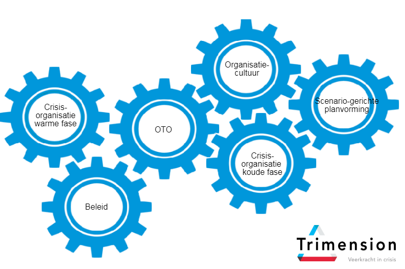 Bovenstaande vraagstukken komen we heel regelmatig tegen bij onze opdrachtgevers. Het afgelopen jaar hebben we daarom intern onze kennis en ervaring gebundeld om meer inzicht te krijgen in de manier waarop crisisorganisaties zich voorbereiden op crises. Wat zien we terug bij beginnende organisaties, aan welke aspecten herkennen we een “volwassen” crisisorganisatie? Op basis hiervan ontwikkelden we ons Volwassenheidsmodel: een model bestaande uit zes thema’s met elk diverse eigen indicatoren die crisispreparatie beïnvloeden. Die thema’s vormen de basis van het “Volwassenheidsniveau” van de preparatie van de crisisorganisatie.