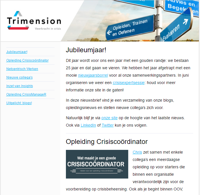 30 January 2017Lees over ons jubileumjaar, de opleiding Crisiscoördinator en netcentrisch werken!