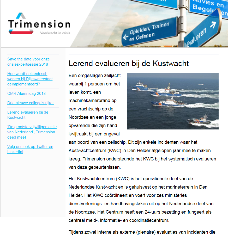 21 March 2018Onze nieuwsbrief is weer uit! Lees dit voorjaar over onze CMR-Alumnidag, lerend evalueren bij de Kustwacht, netcentrisch werken bij Rijkswaterstaat en meer!
