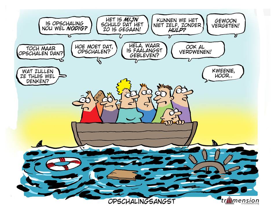 Opschalingsangst: die lastige twijfel of het per se nodig is om nog meer mensen, middelen of mandaat in te schakelen bij het oplossen van een calamiteit. Het is een logische en een natuurlijke impuls om opschalen zo lang mogelijk uit te stellen. Je wil het liever zelf oplossen en je wil zeker niet andere mensen onnodig belasten. Maar je neemt daarmee grote risico’s, want uitstel van noodzakelijke opschaling kan makkelijke leiden tot een escalatie van de situatie. Daarna is een nog verdere opschaling nodig om de crisis te beheersen…