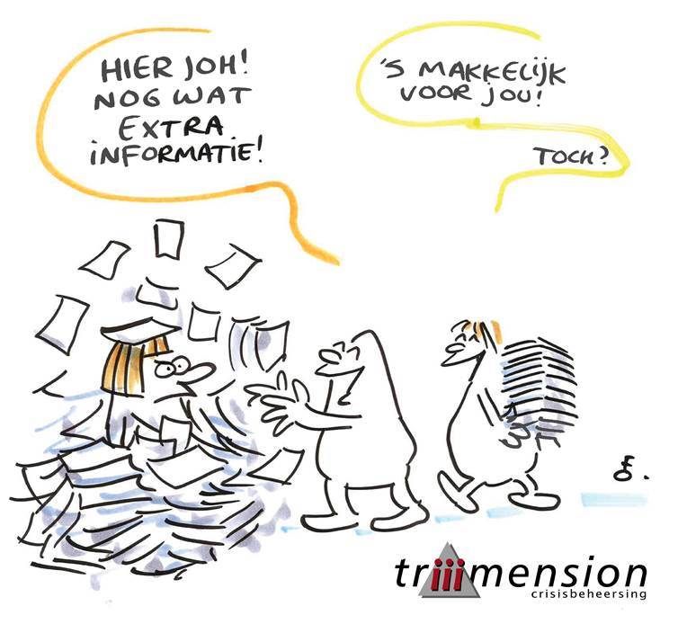 We merken juist dat hoe vaker mensen netcentrisch werken, des te vaker ze zien dat té veel gegevens delen geen zin heeft. Het is belangrijk dat anderen informatie kunnen halen uit de gedeelde gegevens en dat vereist zorgvuldig nadenken over wat je moet delen om het crisismanagement te ondersteunen. In een oefensetting is het makkelijker om elkaar aan te spreken op wat wel en niet noodzakelijke informatie is. Oefen dus vooral en zie dat het systeem zichzelf gaat reguleren: mensen kunnen steeds beter hoofd- en bijzaken van elkaar onderscheiden.